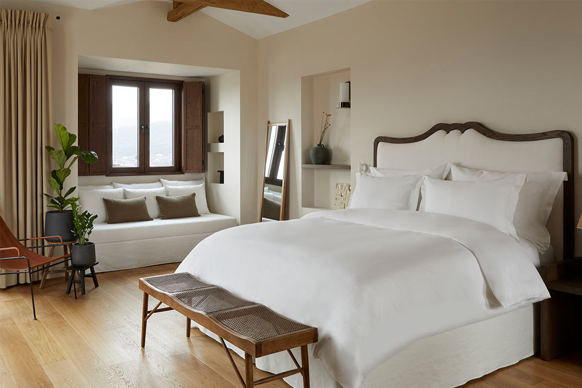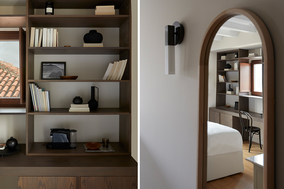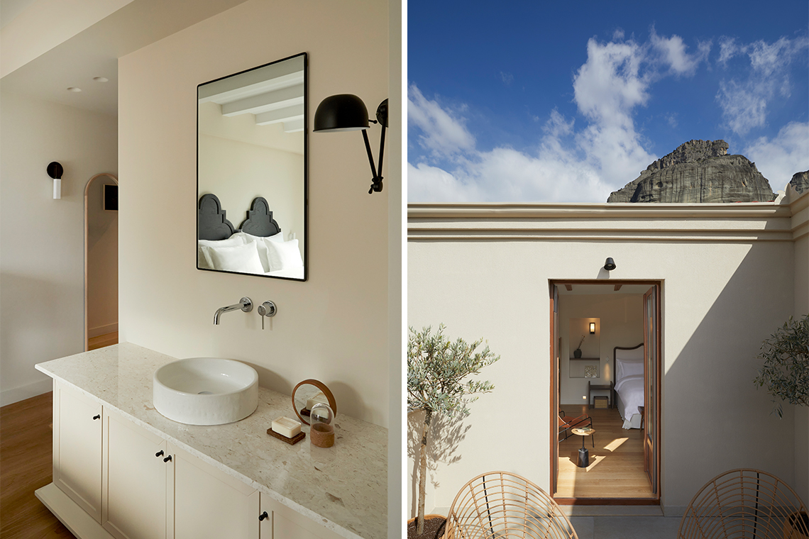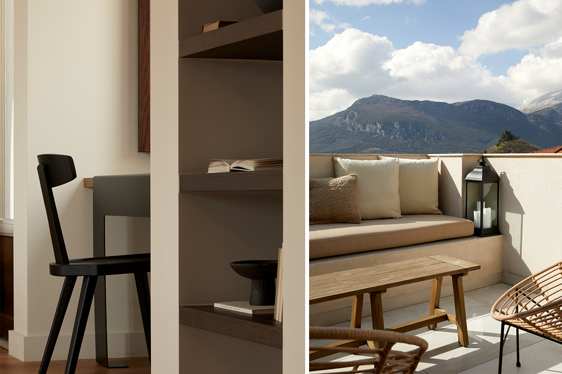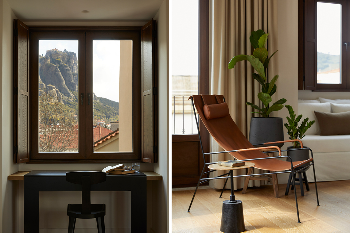 Στο συγκεκριμένο πρότζεκτ, η ομάδα των Babatchas Design Studio δανείστηκε στοιχεία από τη μοναστηριακή καθημερινότητα, όπως τα υλικά και οι χρωματικοί τόνοι που κυριαρχούν στις μονές των Μετεώρων. «Σε αυτό το έργο στόχος μας ήταν να «δέσουμε» την εσωτερική αρχιτεκτονική με το τοπίο. Στη συνέχεια αναζητήσαμε την ουσία της τοπικής μοναστηριακής αισθητικής και την εντοπίσαμε στην μορφολογική ισορροπία ανάμεσα στο απλό και στο αυστηρό, μεταξύ βυζαντινού πλούτου και ασκητικής λιτότητας» αναφέρει η σχεδιαστική ομάδα. Τα δωμάτια ντύνουν τα λινά, πετροπλυμένα βαμβακερά υφάσματα και τα μαξιλάρια από τάπητες ενώ οι δρύινες βουρτσιστές επιφάνειες και τα μάρμαρα Perla και Boticcino κυριαρχούν στους χώρους.