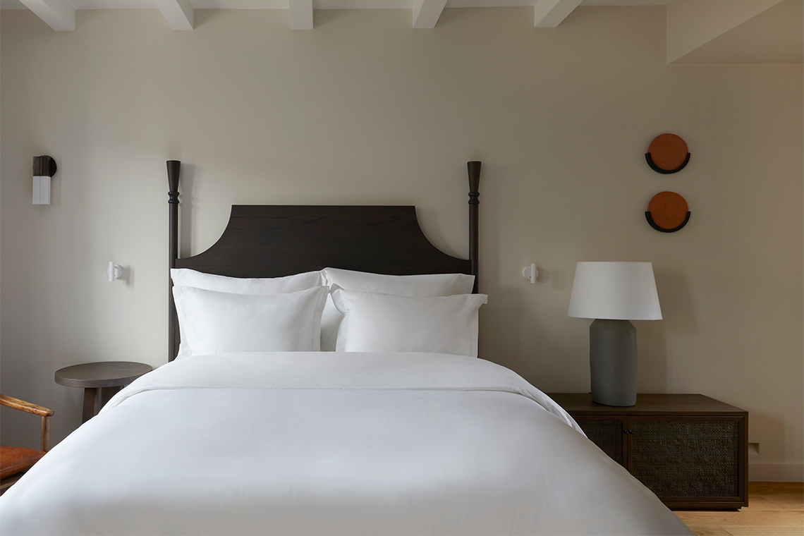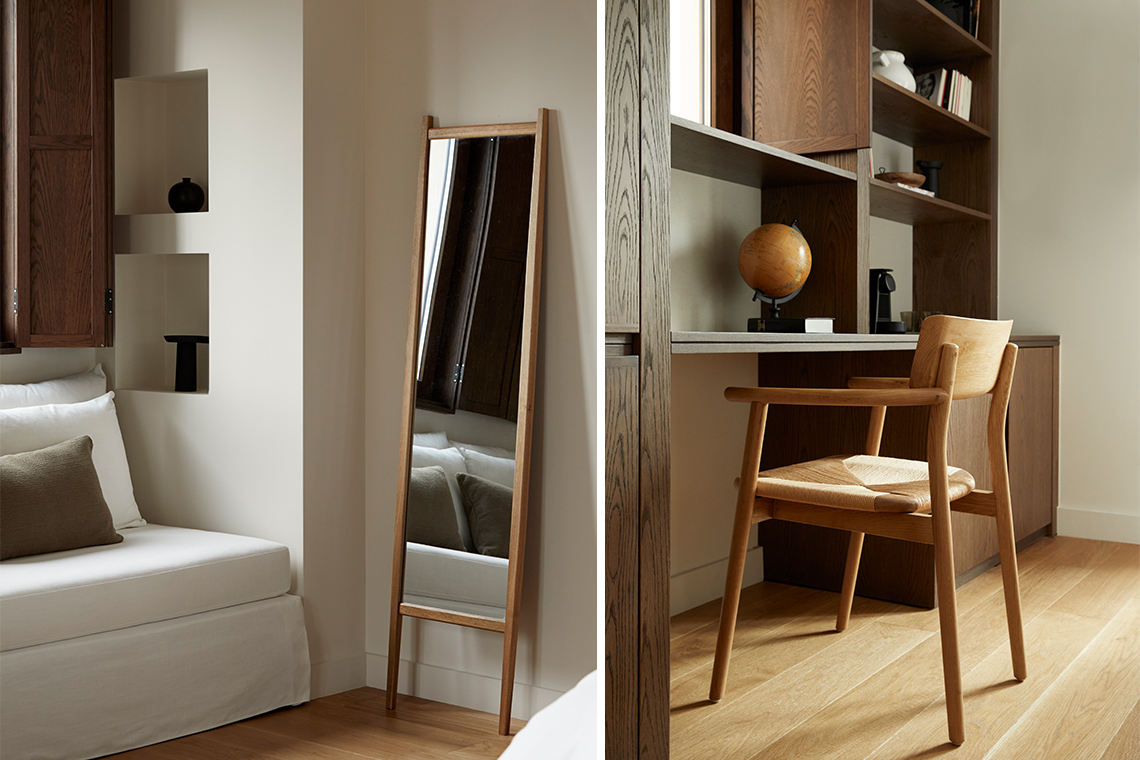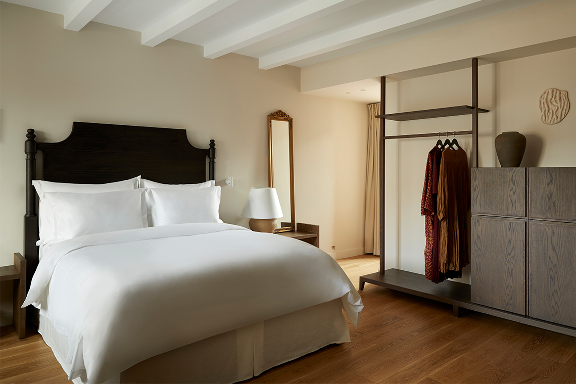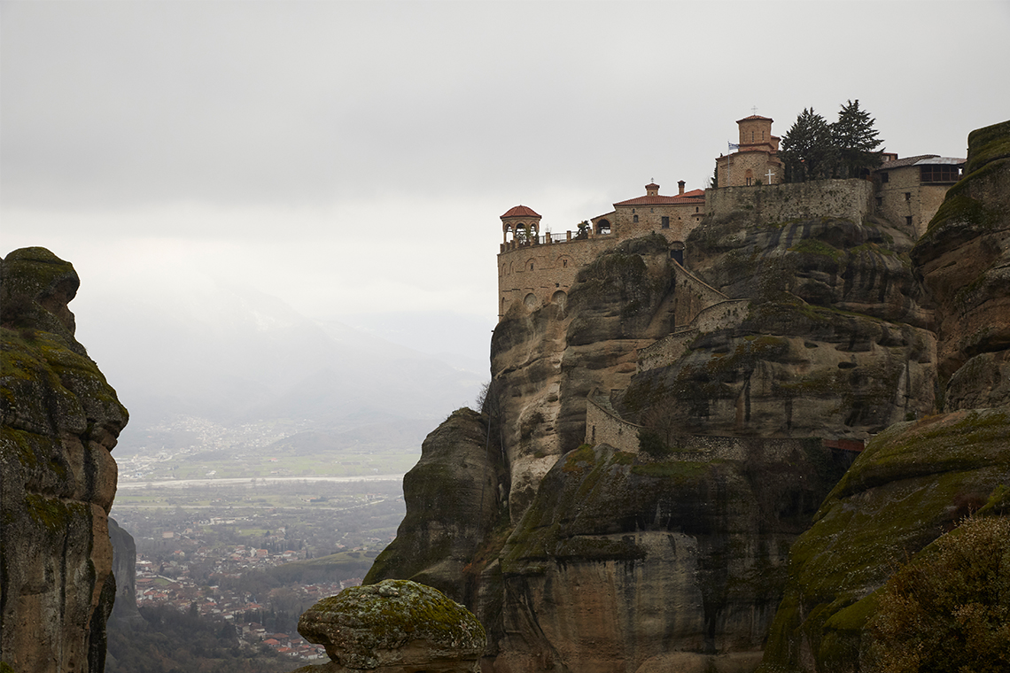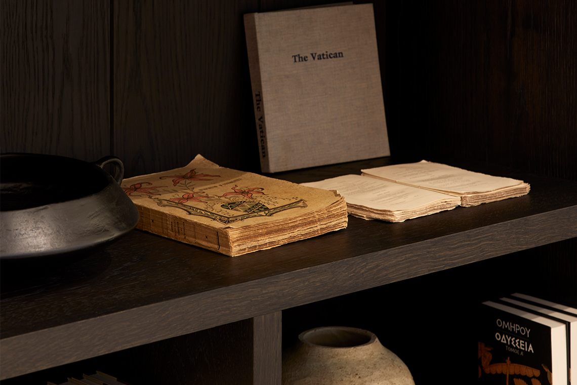 Στο συγκεκριμένο πρότζεκτ, η ομάδα των Babatchas Design Studio δανείστηκε στοιχεία από τη μοναστηριακή καθημερινότητα, όπως τα υλικά και οι χρωματικοί τόνοι που κυριαρχούν στις μονές των Μετεώρων. «Σε αυτό το έργο στόχος μας ήταν να «δέσουμε» την εσωτερική αρχιτεκτονική με το τοπίο. Στη συνέχεια αναζητήσαμε την ουσία της τοπικής μοναστηριακής αισθητικής και την εντοπίσαμε στην μορφολογική ισορροπία ανάμεσα στο απλό και στο αυστηρό, μεταξύ βυζαντινού πλούτου και ασκητικής λιτότητας» αναφέρει η σχεδιαστική ομάδα. Τα δωμάτια ντύνουν τα λινά, πετροπλυμένα βαμβακερά υφάσματα και τα μαξιλάρια από τάπητες ενώ οι δρύινες βουρτσιστές επιφάνειες και τα μάρμαρα Perla και Boticcino κυριαρχούν στους χώρους.