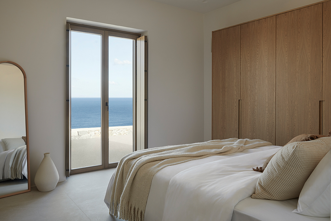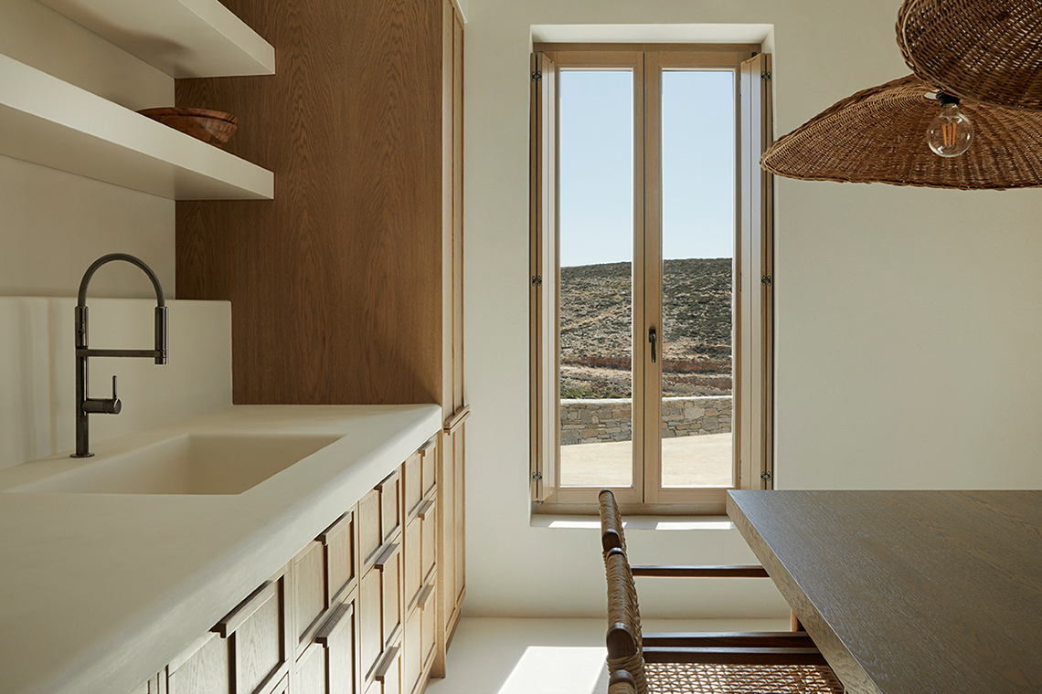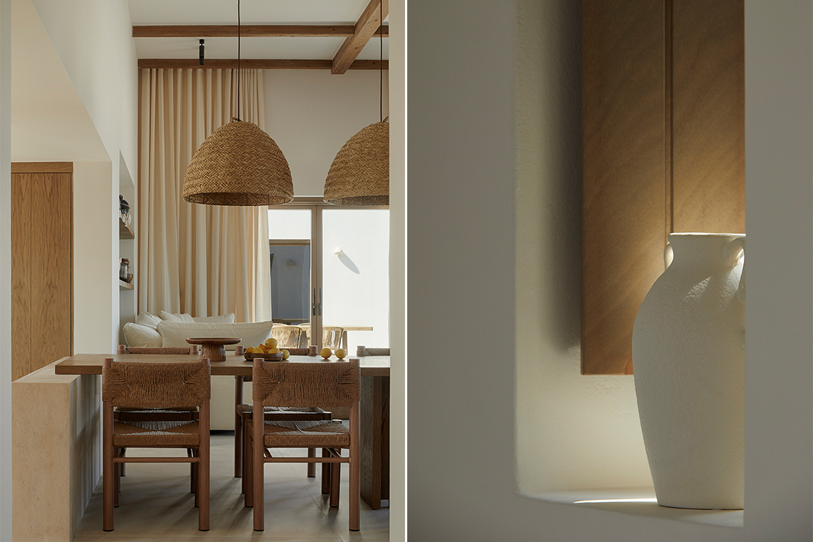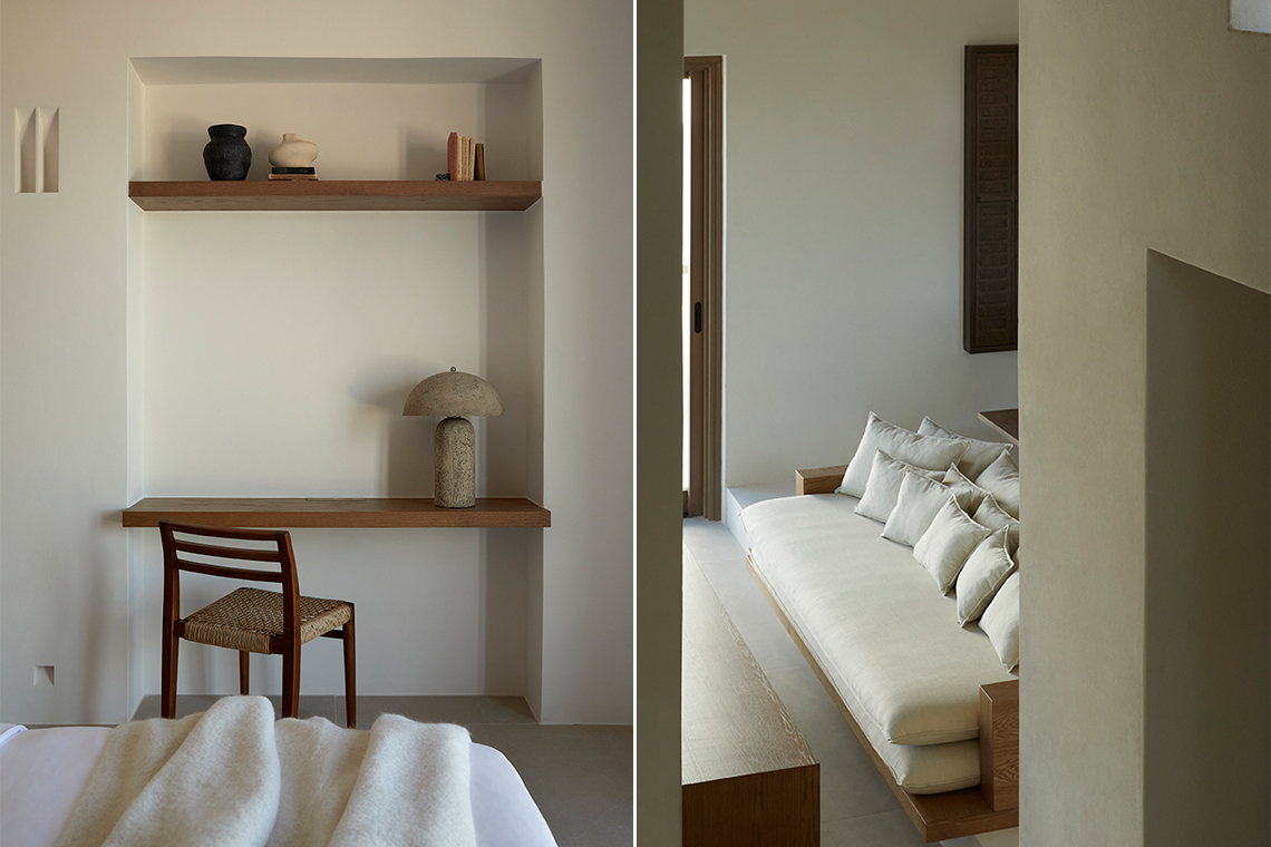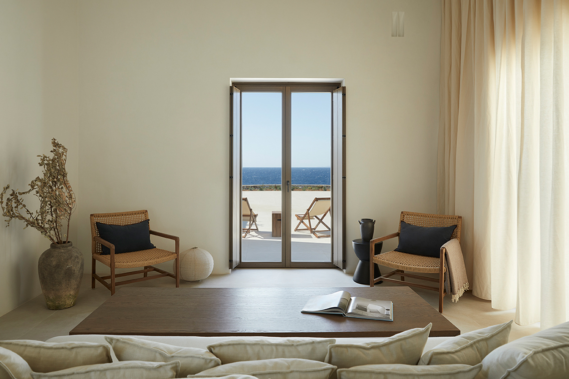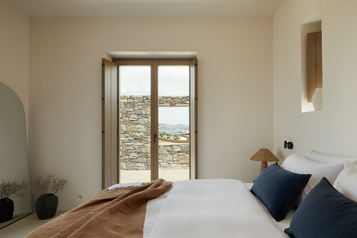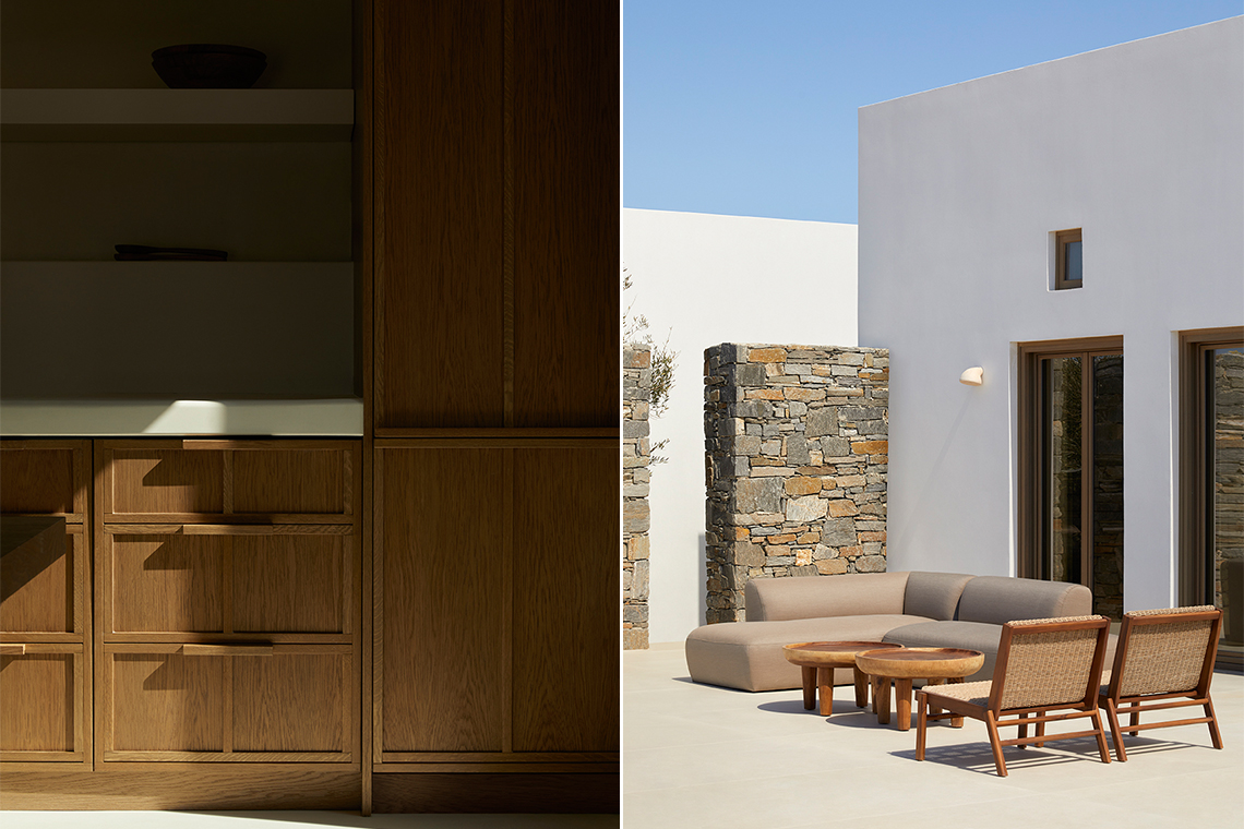 The materials are locally sourced and reflect the character of the place: stone, aged wood, and natural plasters in earthy tones. They form an authentic and timeless whole that does not seek to impress, but to coexist with the land, the sea, and the Cycladic light.