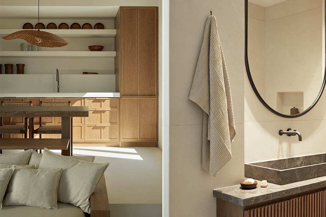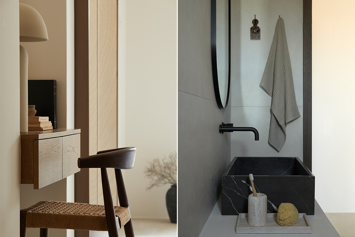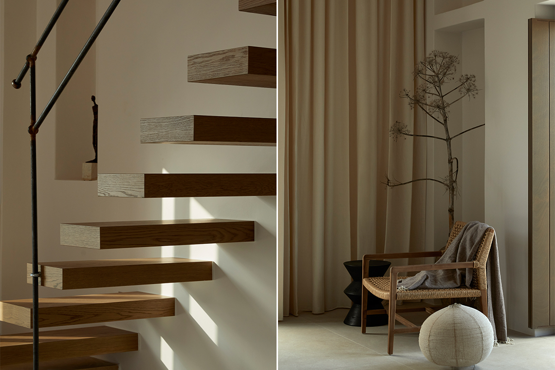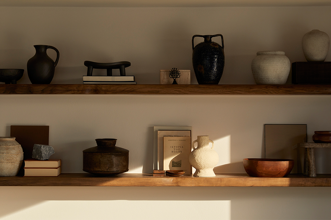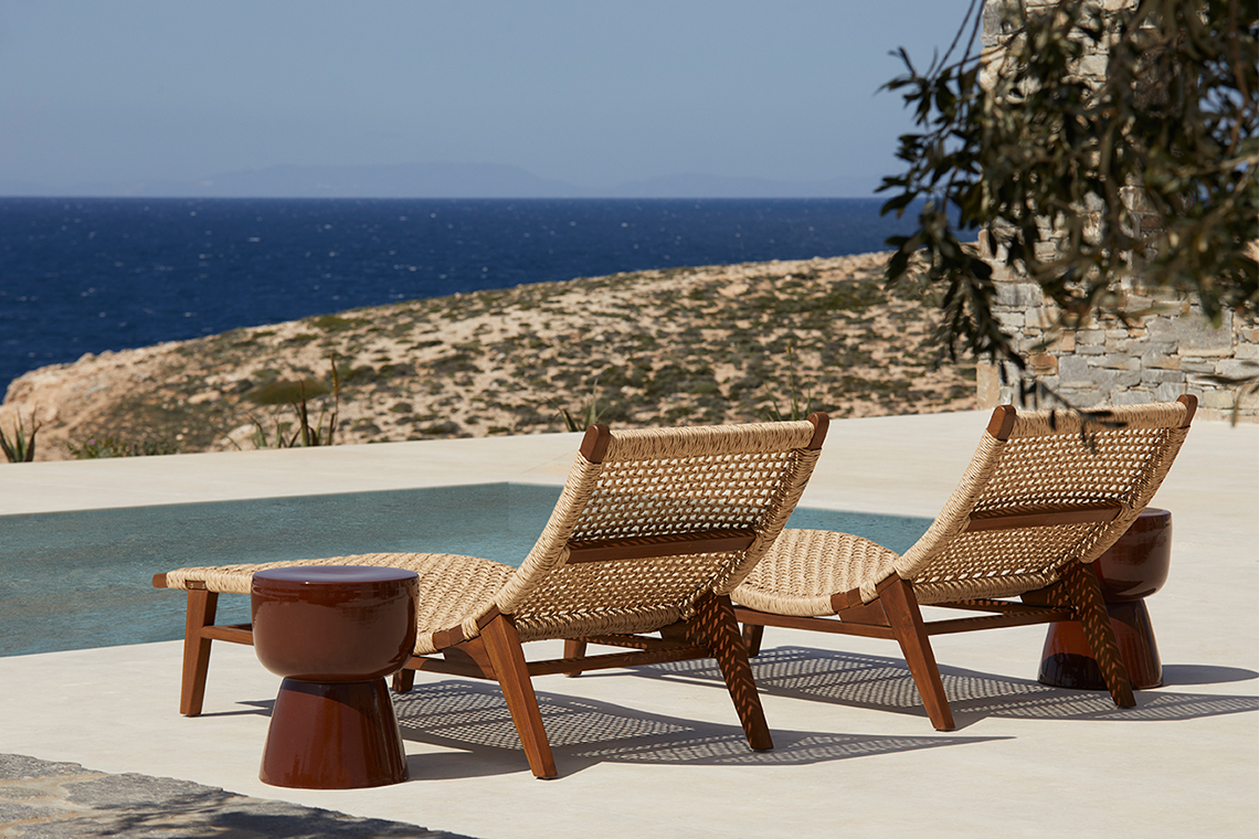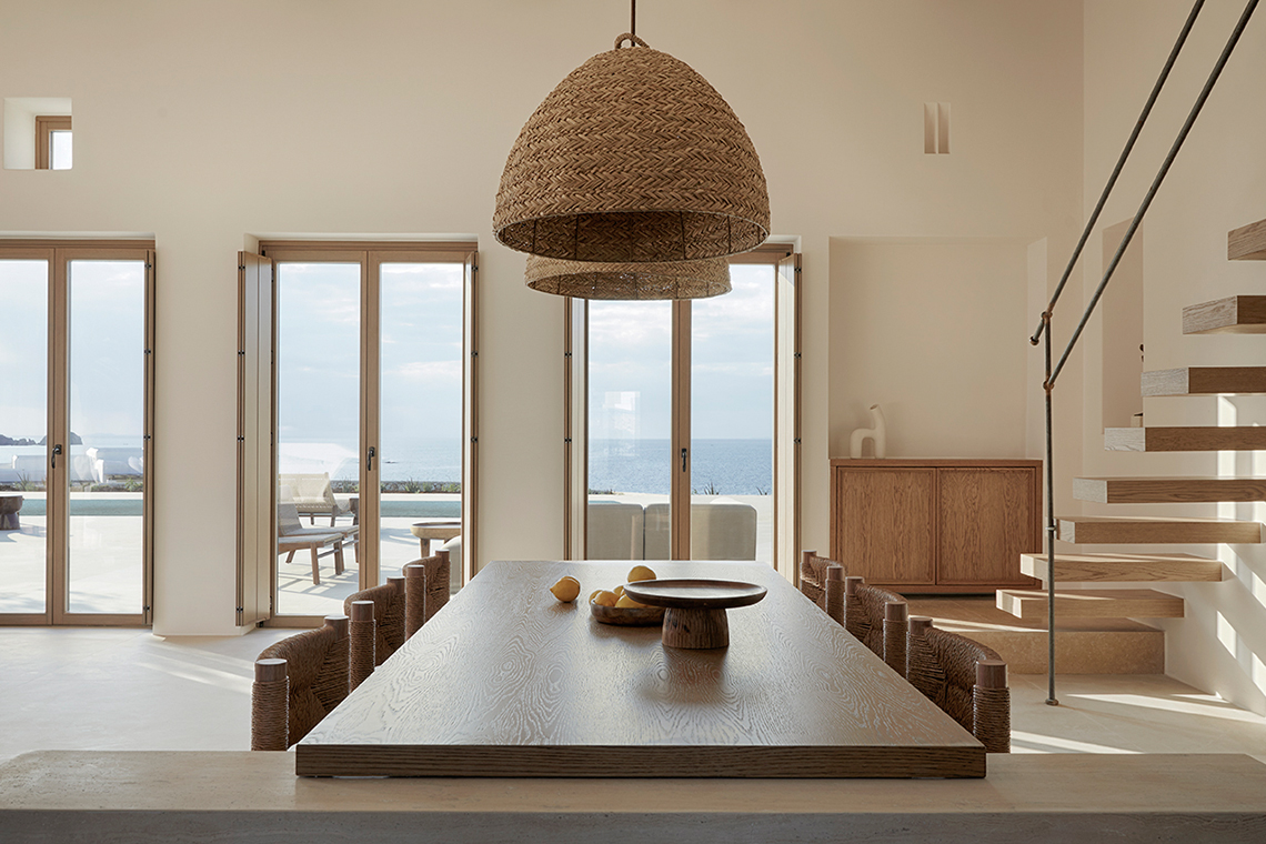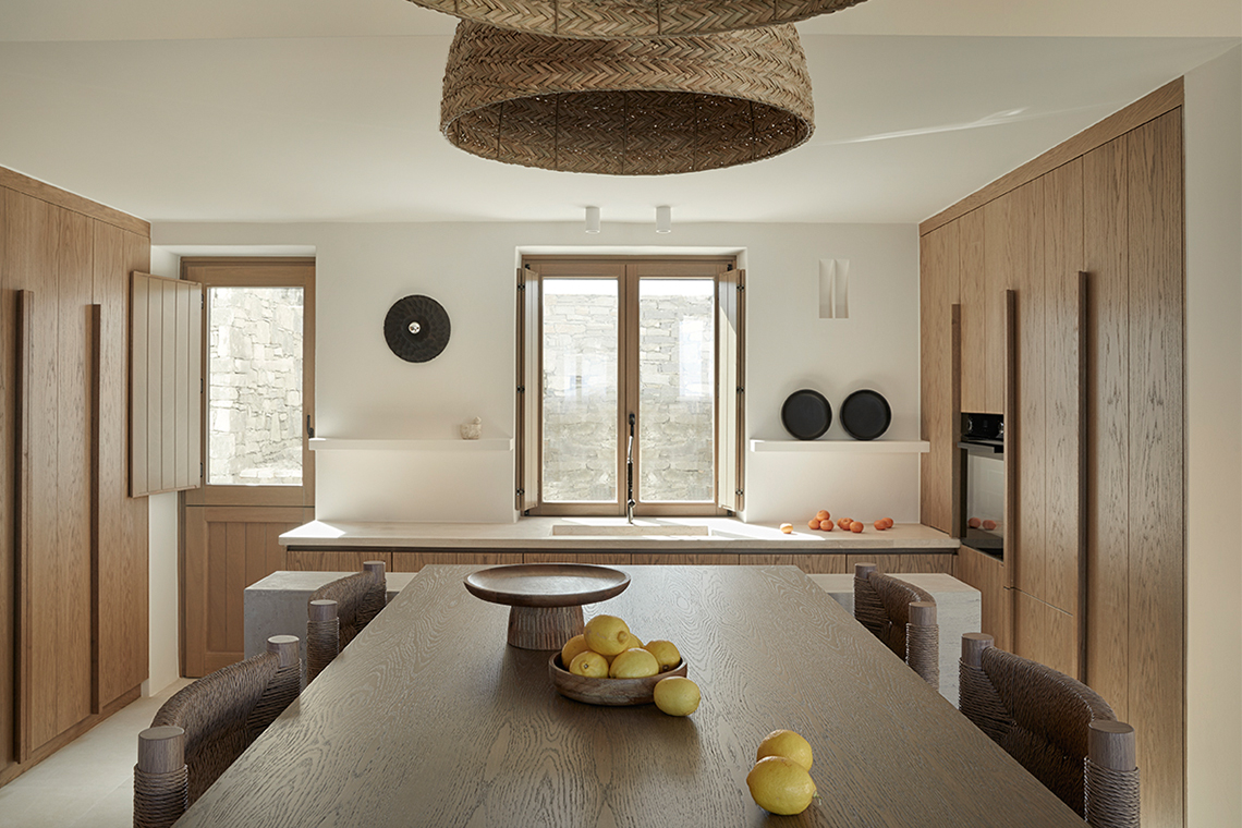 The materials are locally sourced and reflect the character of the place: stone, aged wood, and natural plasters in earthy tones. They form an authentic and timeless whole that does not seek to impress, but to coexist with the land, the sea, and the Cycladic light.